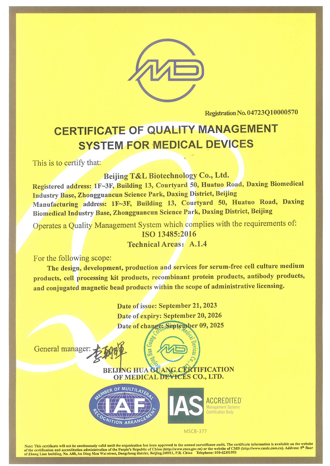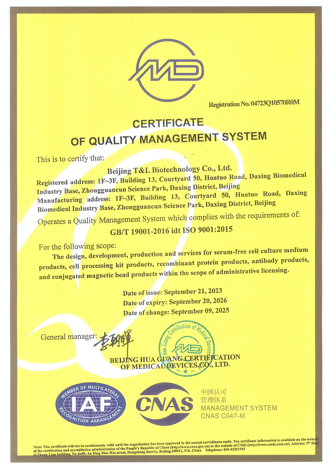 公司建有3400㎡的研发实验室及GMP级洁净车间,包括细胞分选磁珠开发平台、真核与原核蛋白表达工程平台、无血清培养基开发平台,通过ISO13485和ISO9001双质量体系认证,部分产品已获美国FDA DMF备案。