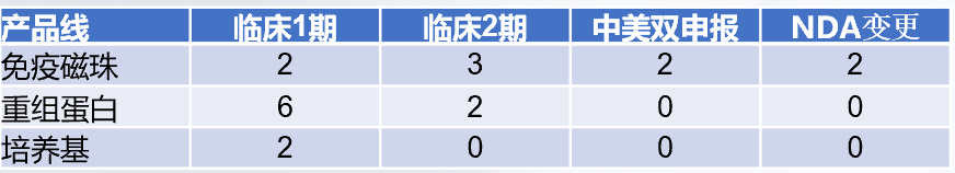 深耕生物医药关键原料领域,同立海源始终以高品质、高稳定性的产品,深度赋能客户新药研发与产业化进程。目前,我们的核心产品已广泛进入客户药物研发管线,为其临床推进提供坚实支撑。其中免疫磁珠产品线展现了全面的管线覆盖能力,在临床Ⅰ期、Ⅱ期、中美双申报乃至NDA变更阶段均有项目应用,验证了其工艺的可靠性与规模化生产的成熟度。依托同立海源健全的GMP质量管理体系,我们的重组蛋白产品线已为药物研发的早期临床阶段提供了坚实可靠的关键原料支持。同时,我们的培养基产品也已成功导入客户早期研发管线,支持细胞培养工艺的开发。