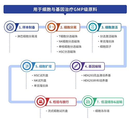 同立海源生物深耕CGT领域多年,扎根GMP级别核心原料的研发及生产,致力于为不同细胞疗法客户提供产品整体解决方案,覆盖细胞生产环节所需原料,包括样本制备、细胞分离、细胞激活、基因编辑、细胞扩增等,可助力客户临床研究及IND申报,加速推进细胞与基因治疗产业化。